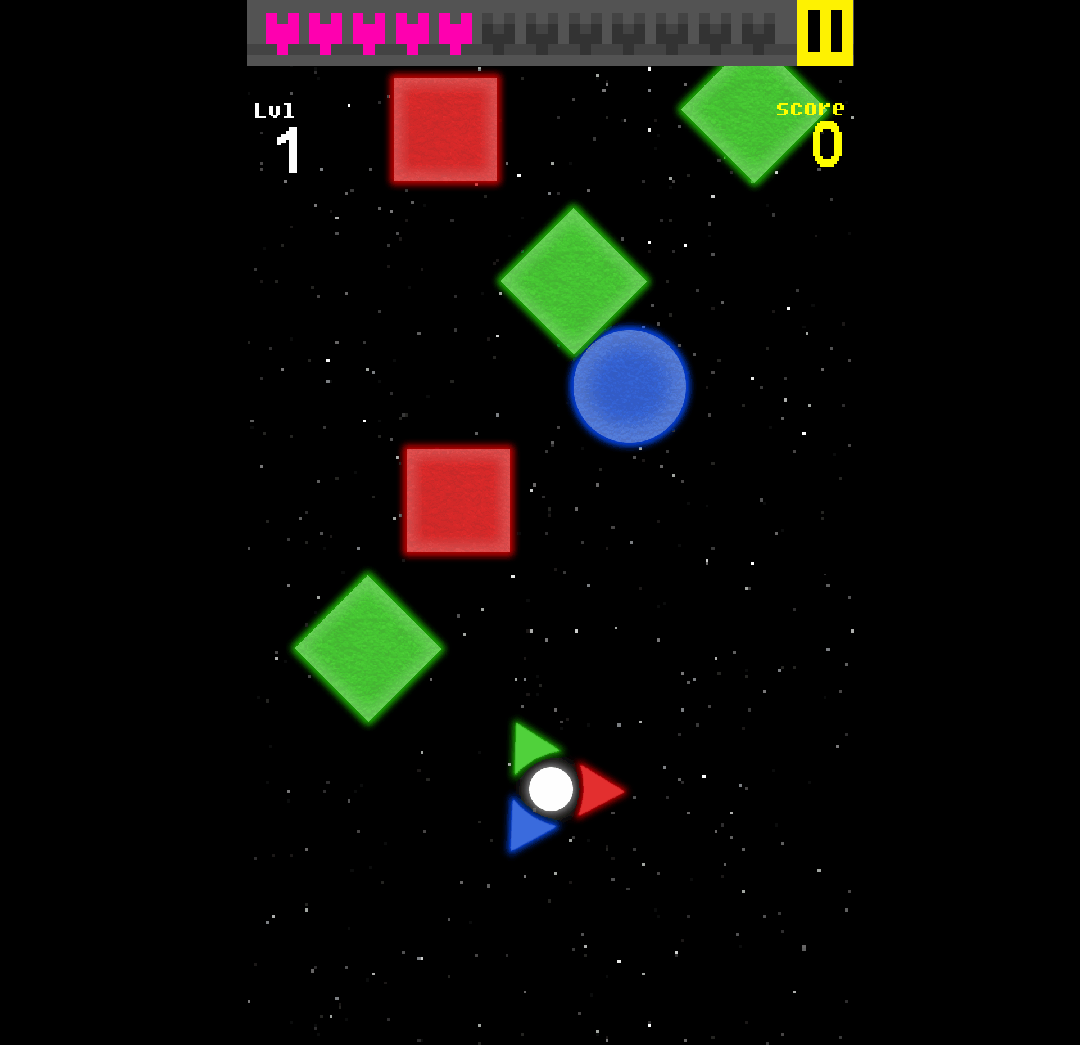 Travel through space and collect as much score as possible by matching the color of the points of the GeoShifter(player character) with the color of the Geos(the geometric shapes that fall from top of the screen).